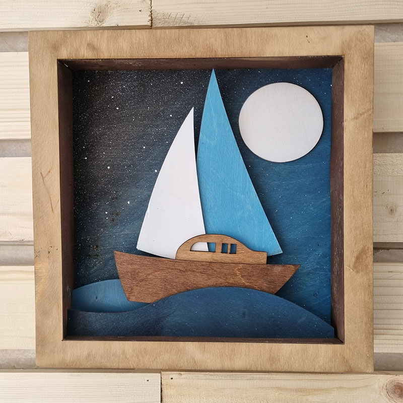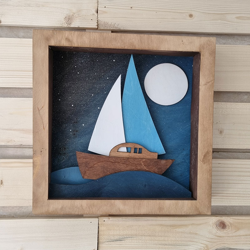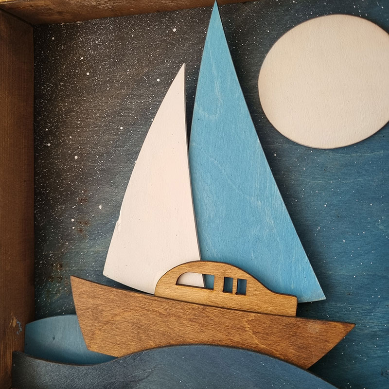 تابلو چوبی دستساز با طرح قایق و دریا در شب مهتابی . ترکیبی از هنر نجاری و نقاشی مفهومی مناسب برای دکوراسیون آرامبخش منزل یا دفتر کار