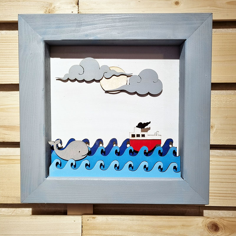 تابلو دکوری چوبی با طراحی فانتزی از کشتی، نهنگ و دریای مواج. ساخته شده با جزئیات ظریف و حس داستانپردازی. مناسب فضاهای مدرن، کودکانه و هنری.