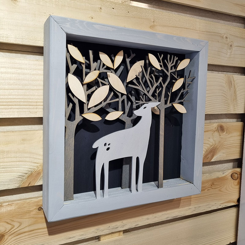 .. پاییز گوزن طرح انتزاعی ، مینیمال قاب ۴ گوش ۳۰ سانتیمتر تهیه شده از چوب طبیعی کاج روسی منظره رویایی از گوزن سفید نماد پاکی و شکوه در دل طبیعت در شب جنگل پاییزی