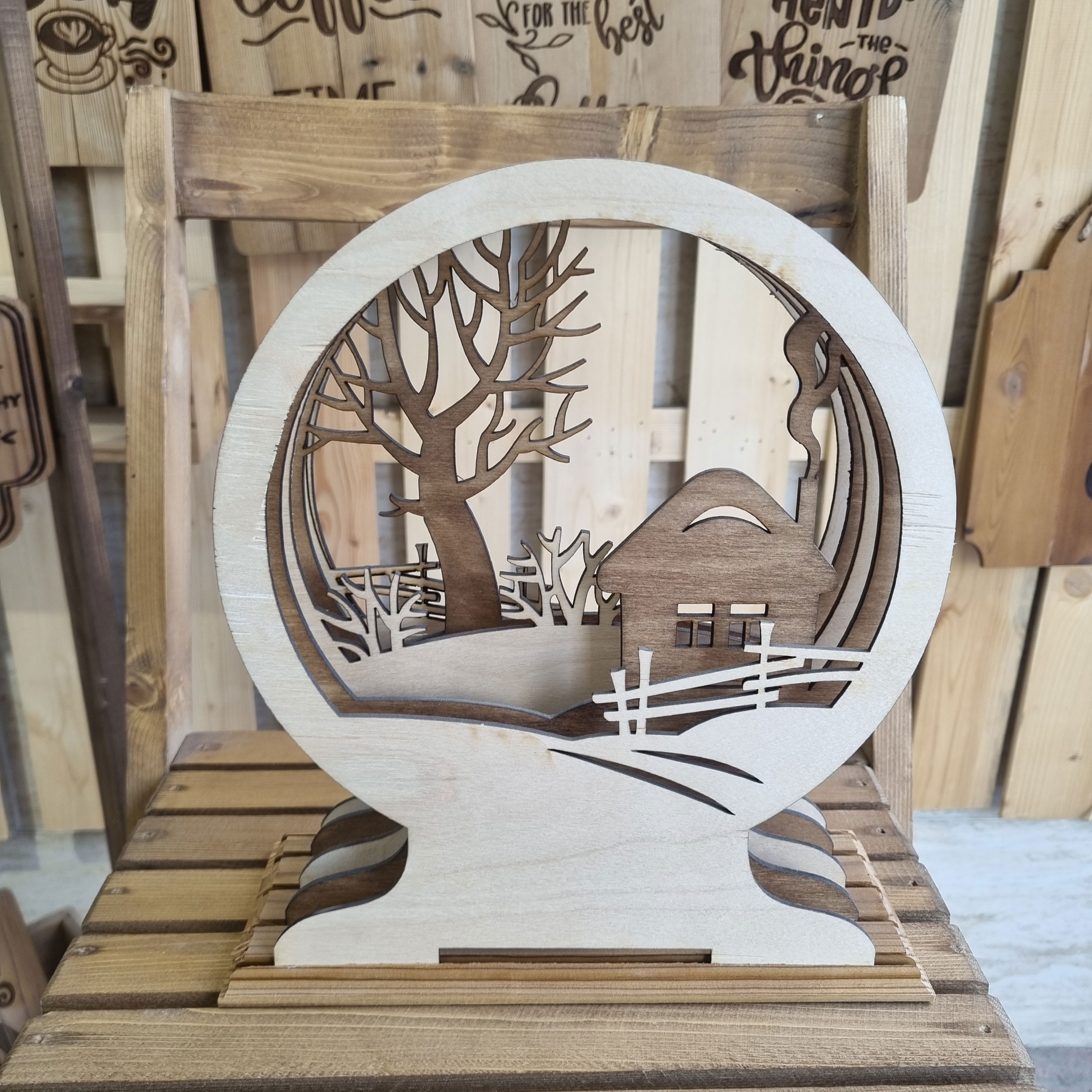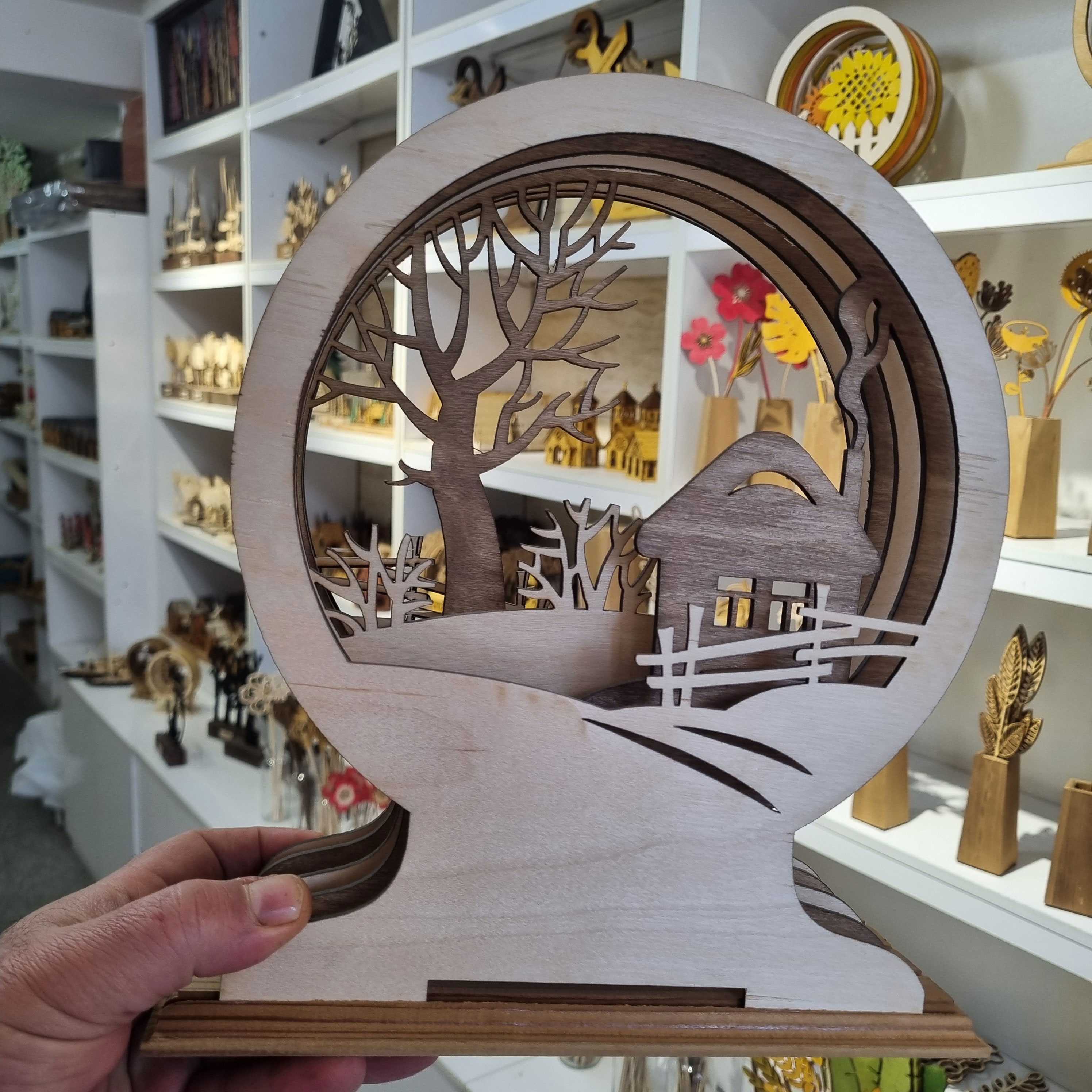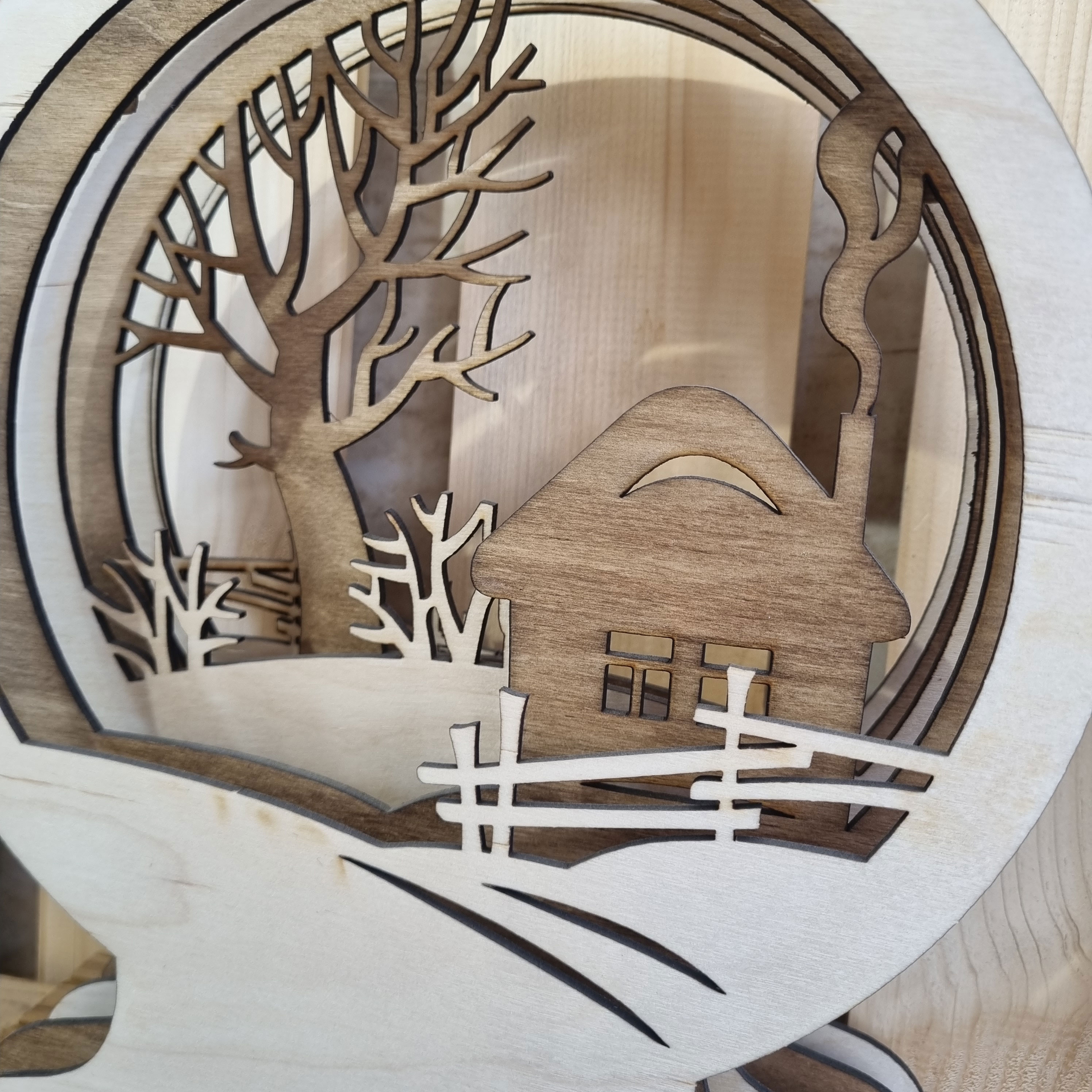 دکوری چوبی دهکده زمستانی مالتی لایر 3 بعدی ساخته شده از5 لایه که بروی منطبق شده اند و به روش خلاقانه یک تصویر زیبا و 3 بعدی عمق دار از منظره طبیعت زمستانی یک دهکده آرام را به شما هدیه میدهد