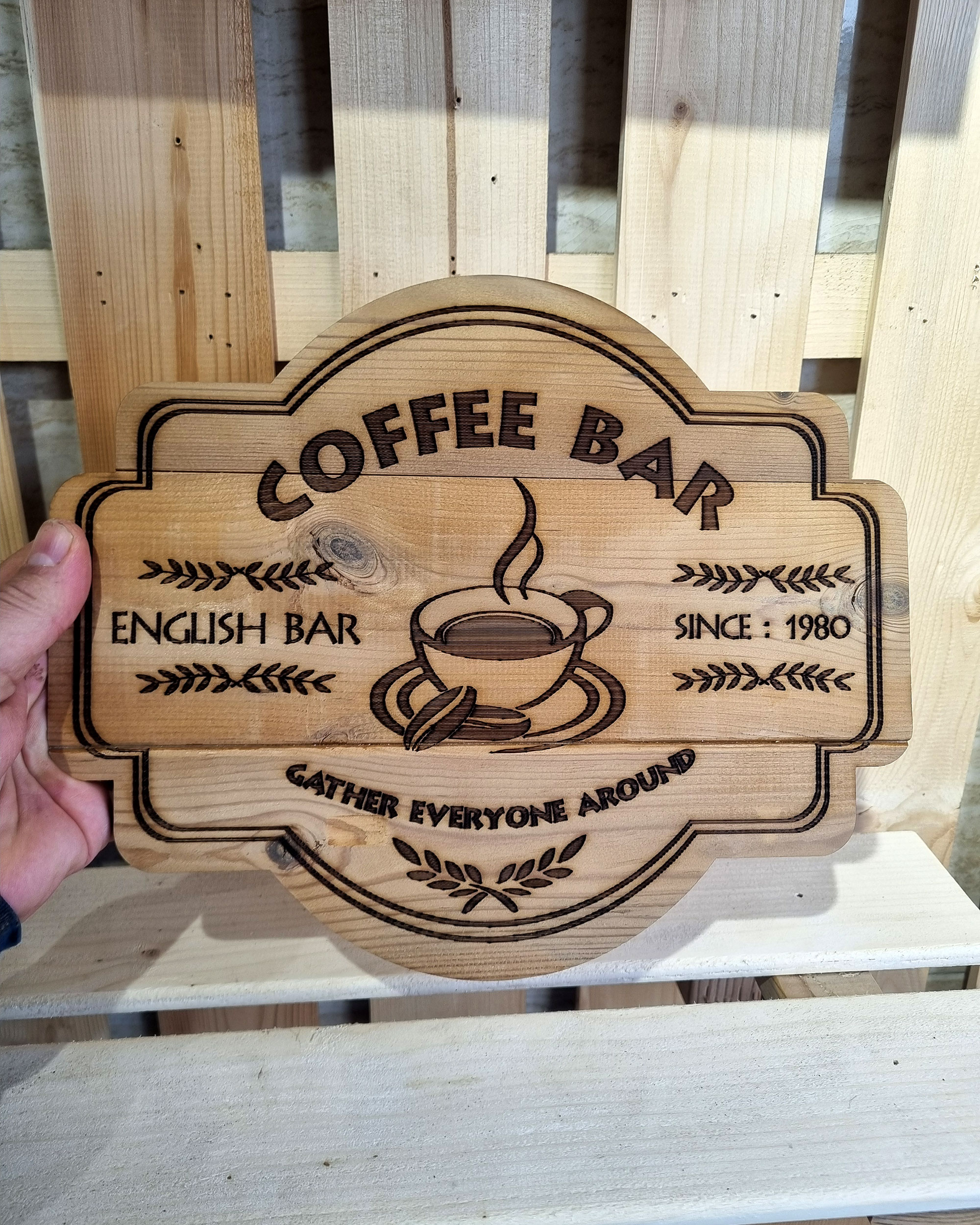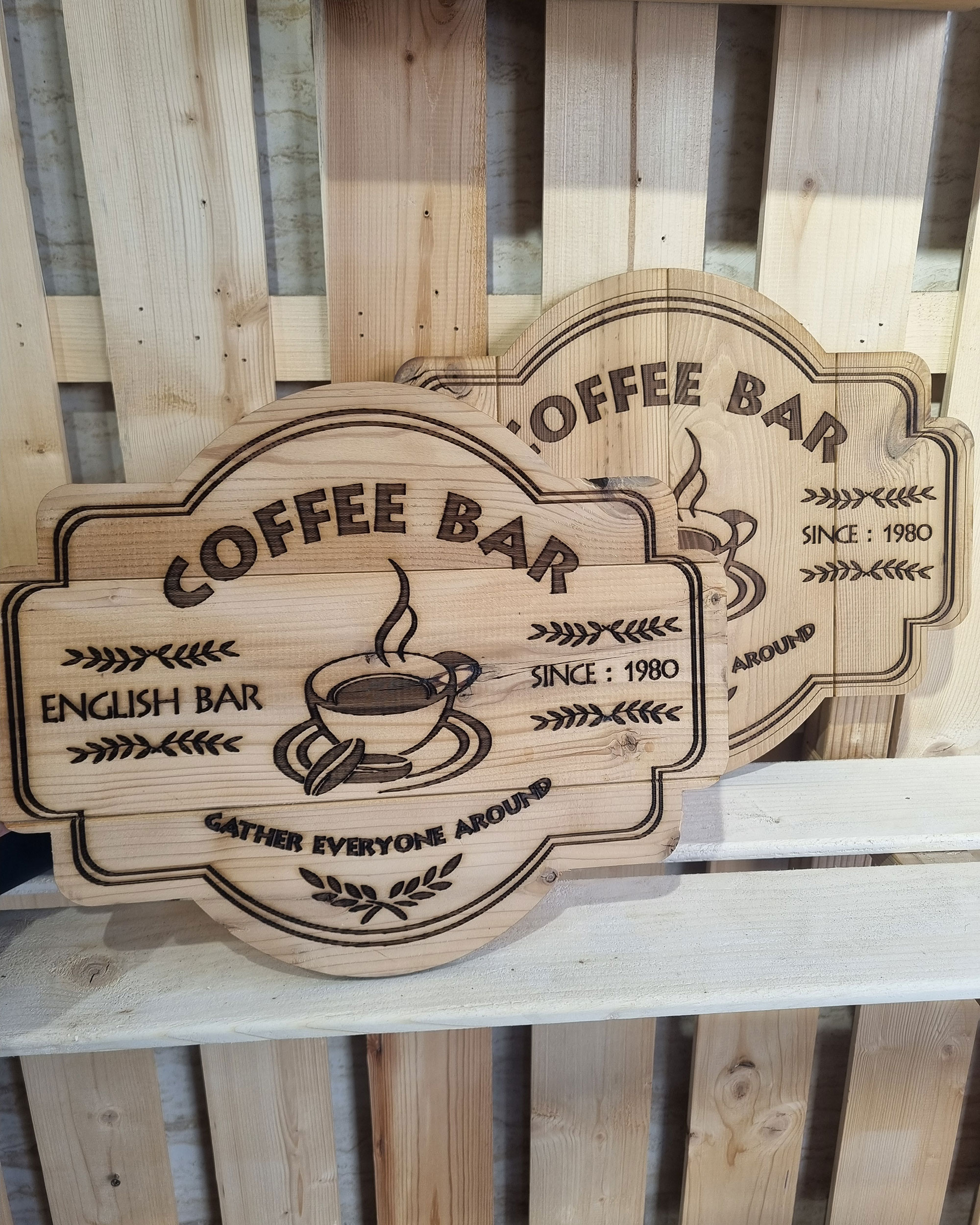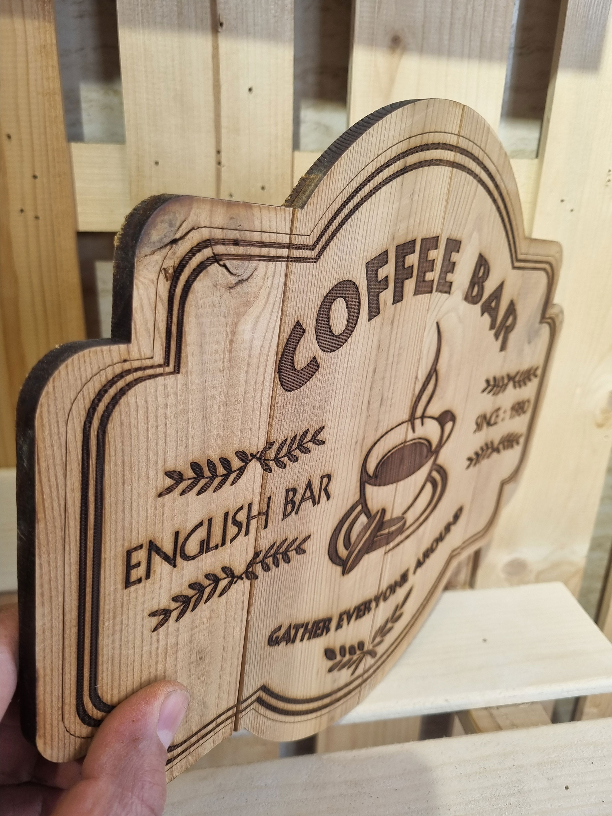 پلاک رویال کافه بار ساخته شده از چوب ترمو وود با نوشته های حکاکی لیزری