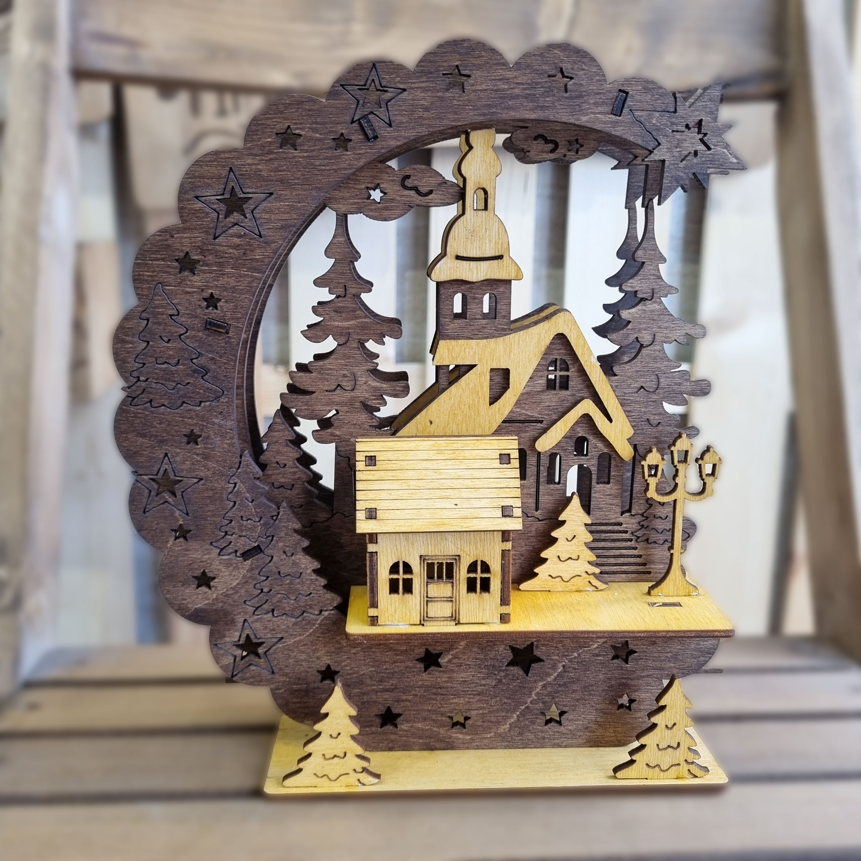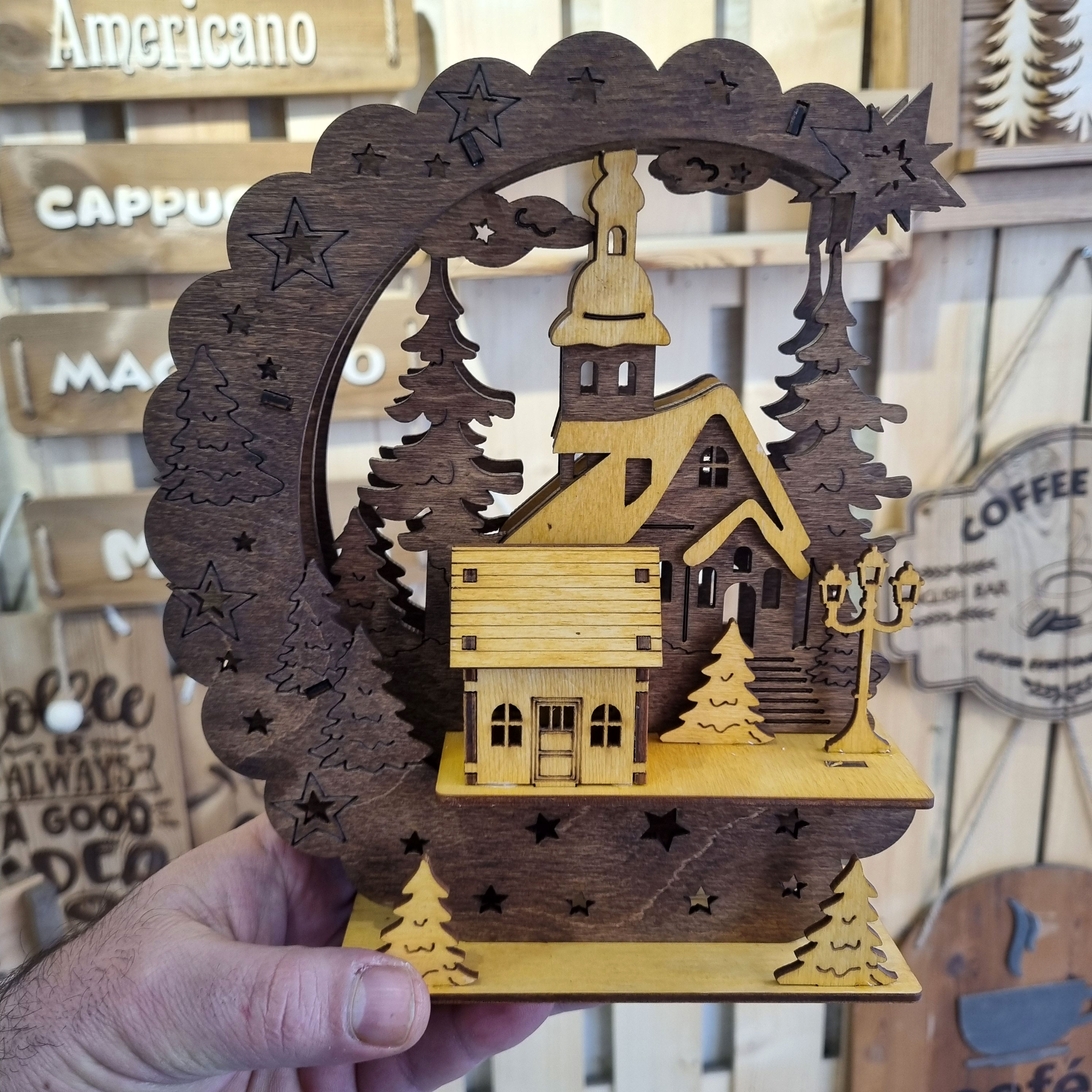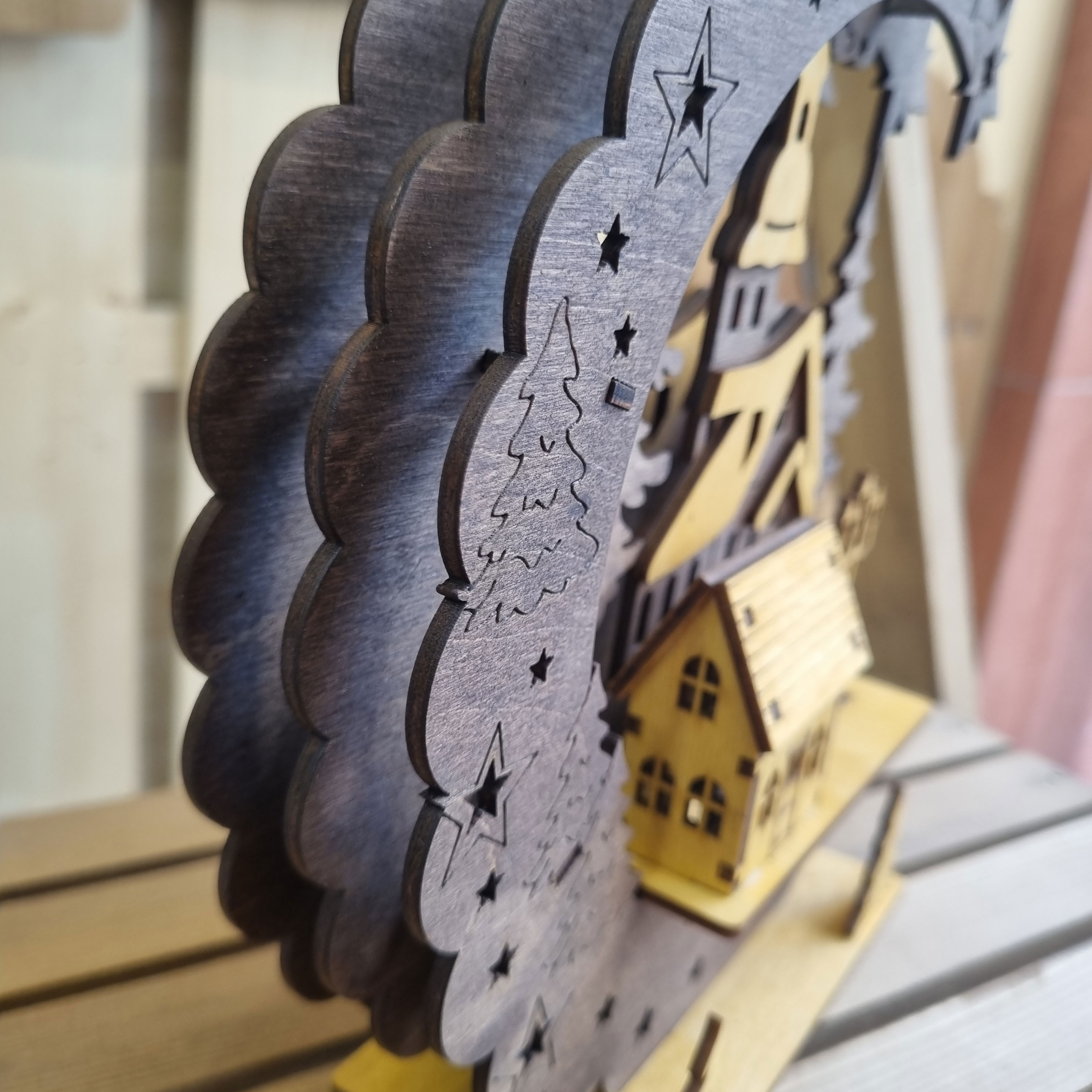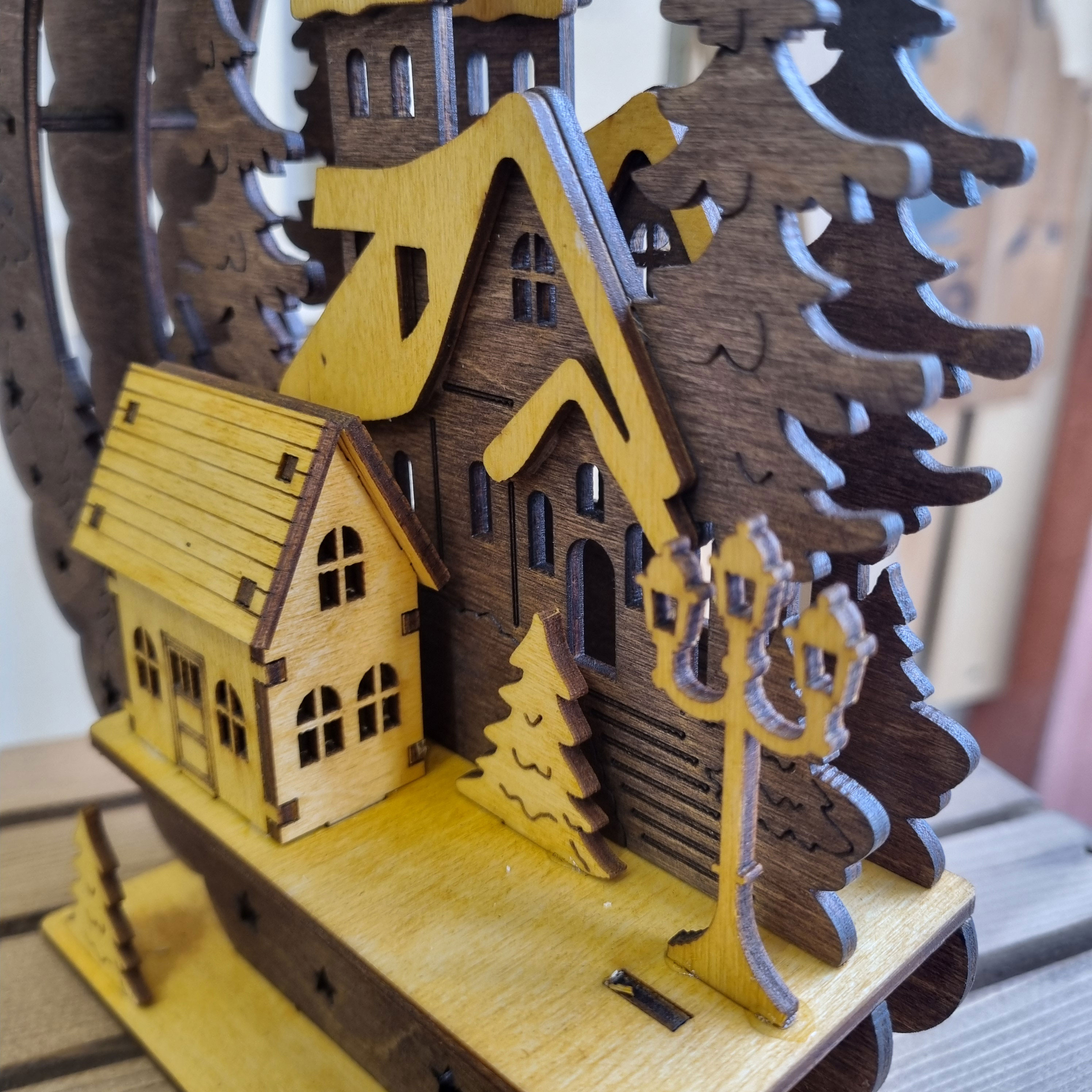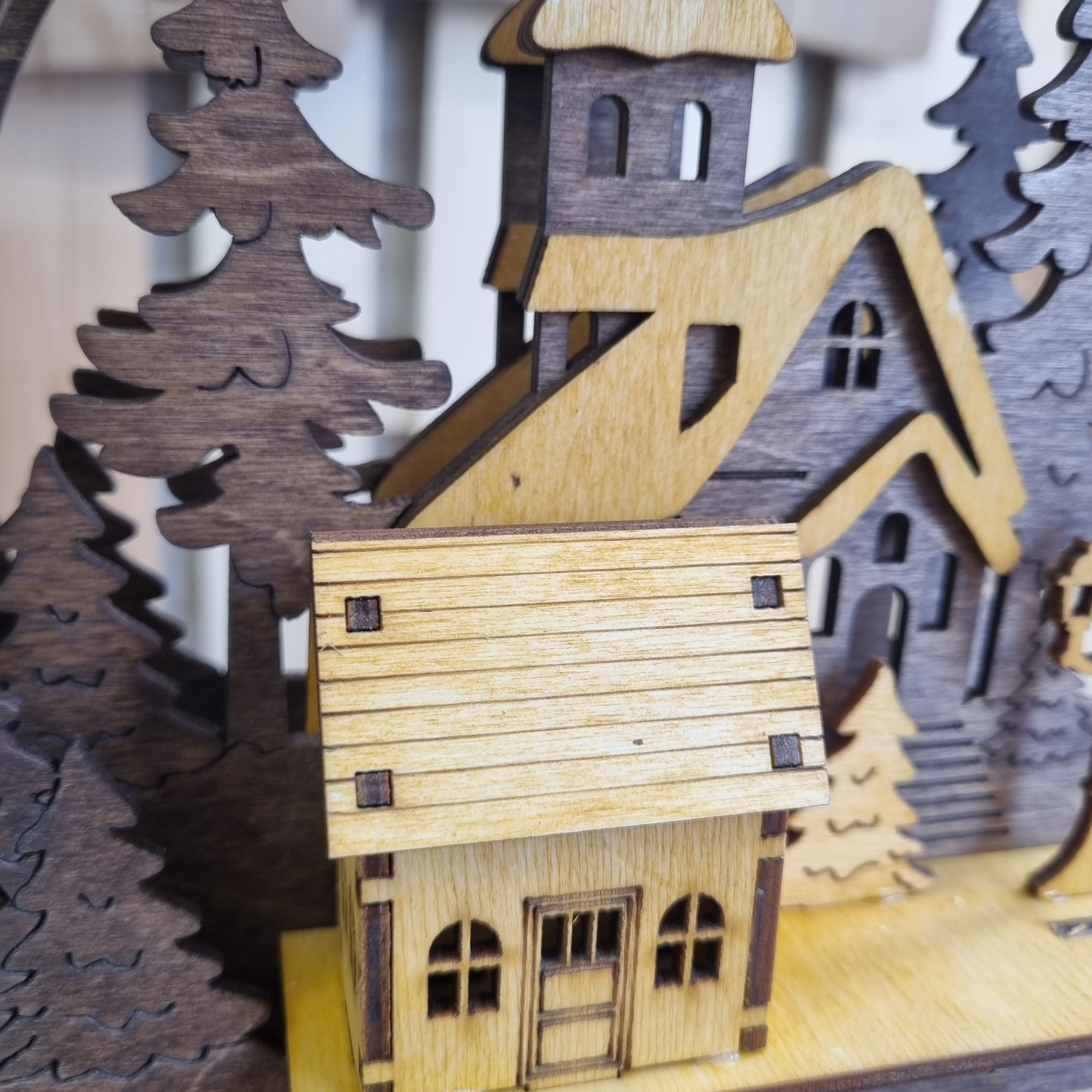 ساخته شد از چوب پلای وود روسی با بالاتریین کیفیت ساخت در تابلو و دکوری های لایه ای . متشکل از 3 لایه و یک کلبه ویلایی نمایی 3بعدی را به نمایش میگدارد