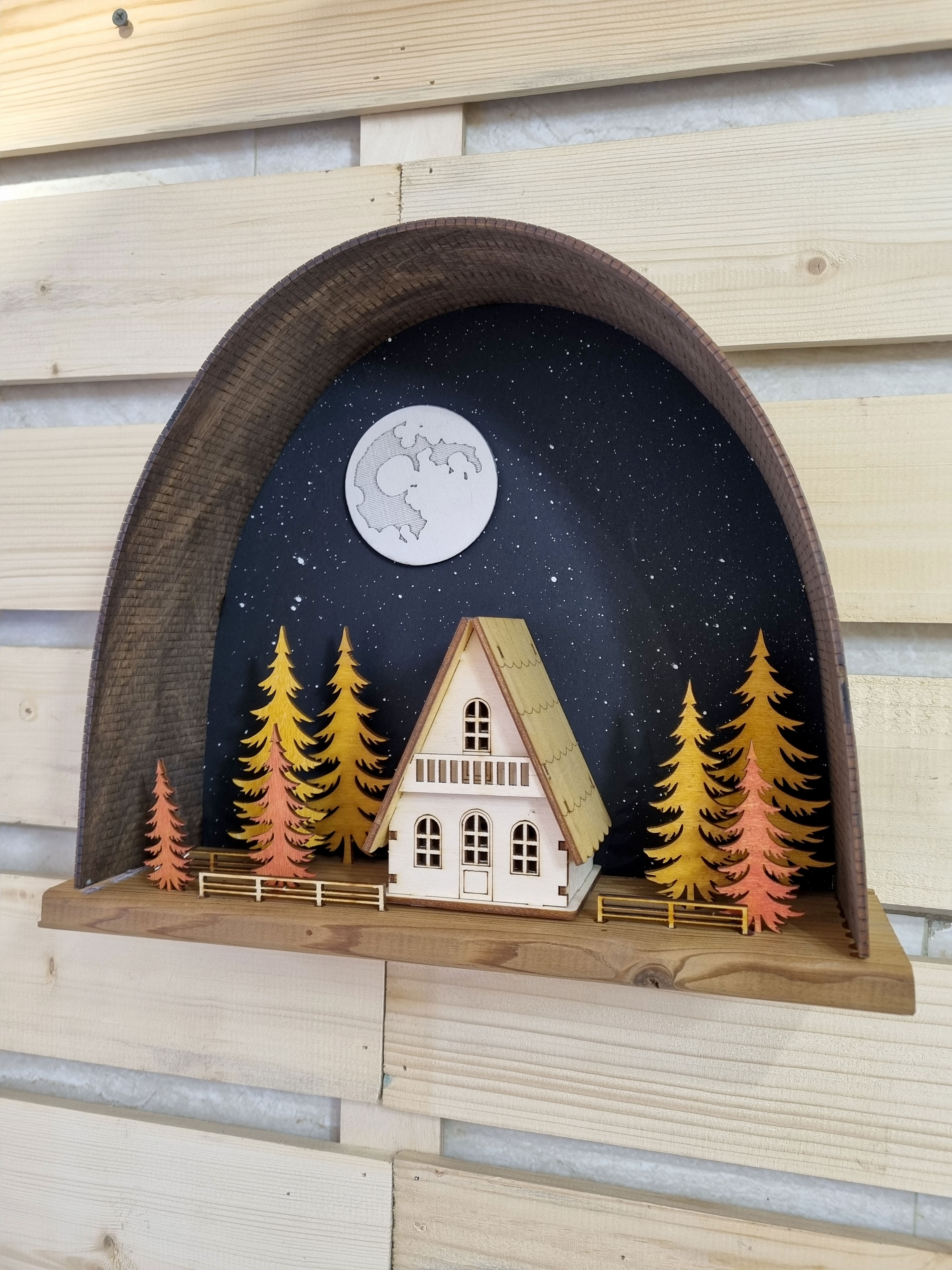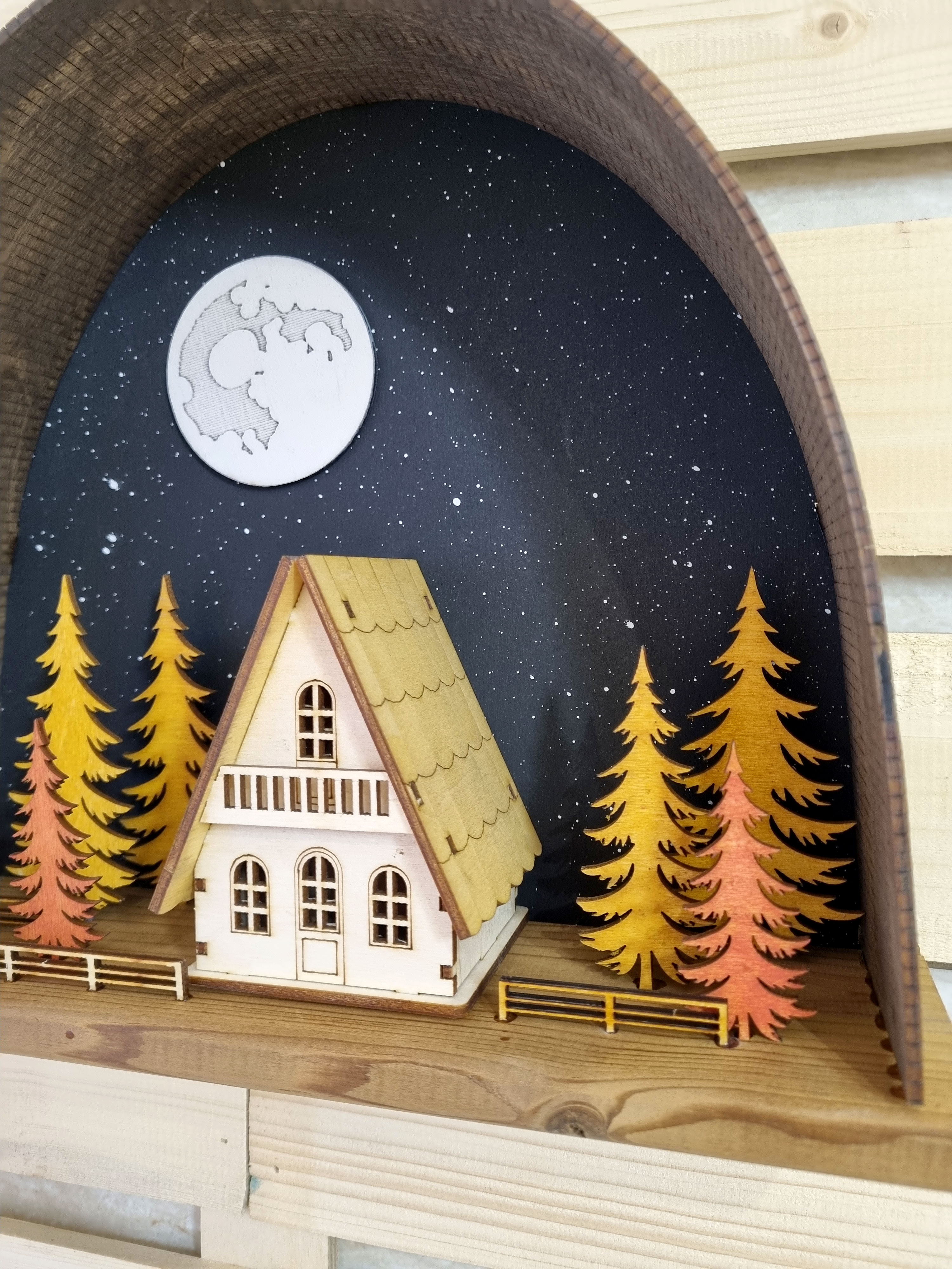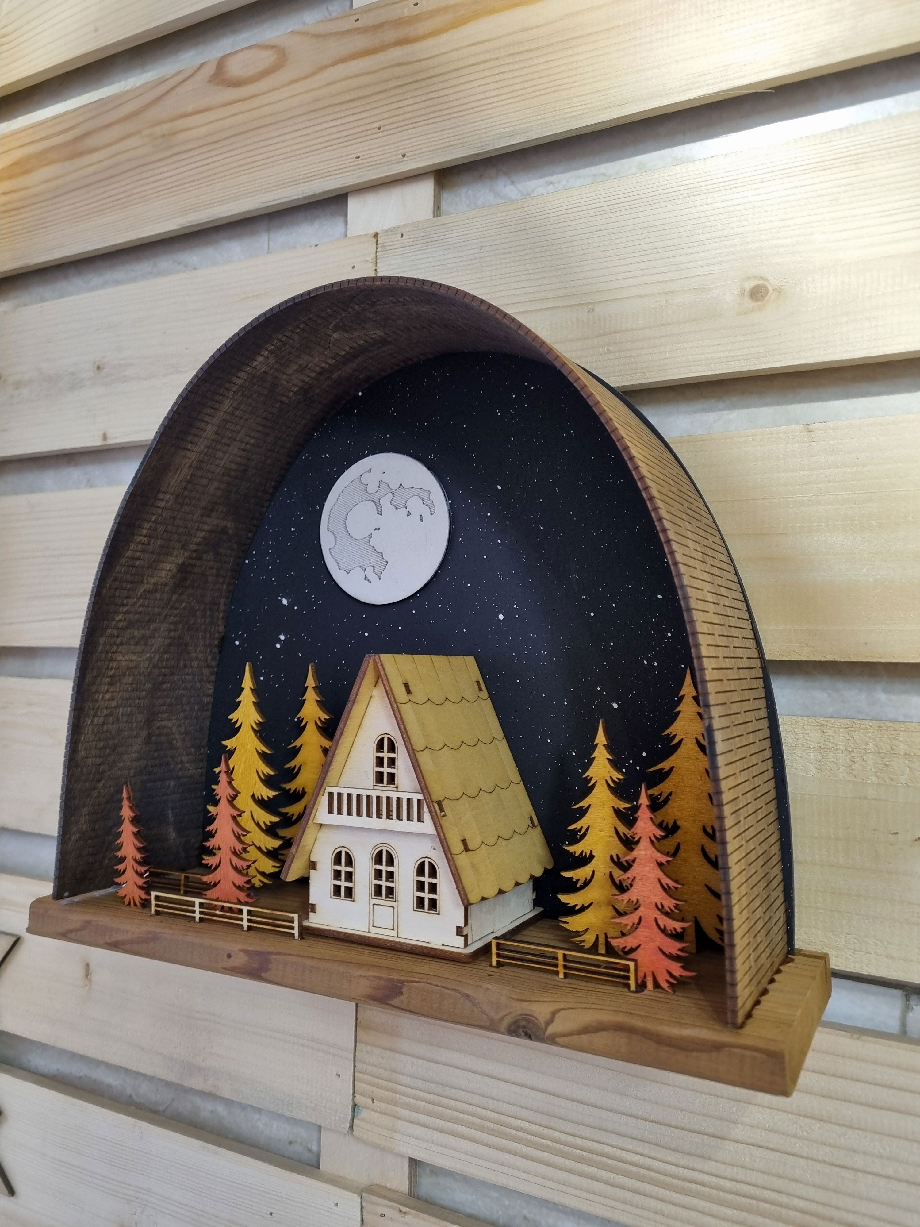 تابلو دکوراتیو چوبی منظره جنگل کاج پاییزی در شب