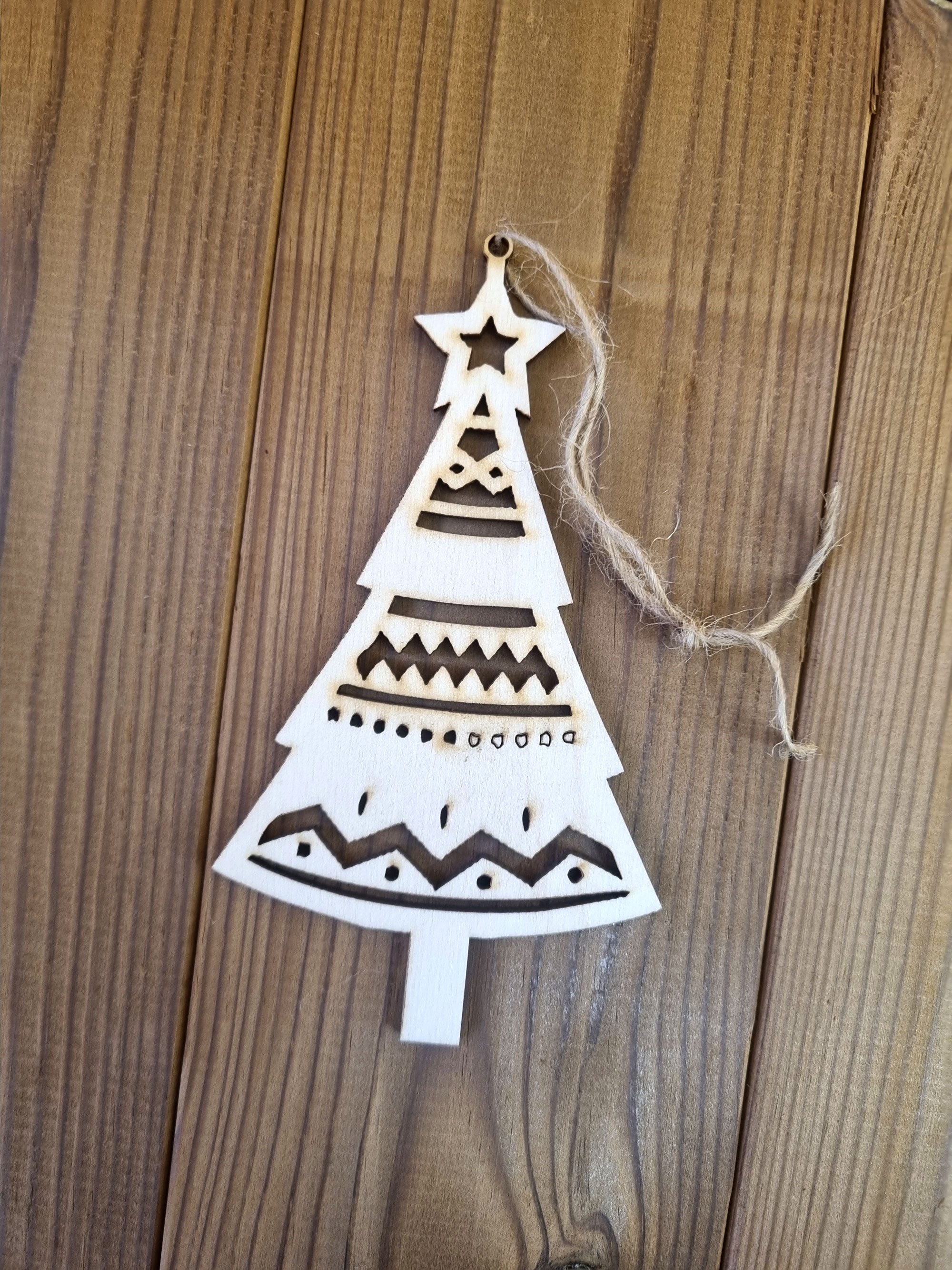 اکسسوری چوبی طرح درخت کاج کریسمس دارای قلاب اویز جنس چوب ورق چوب پلای وود روسی با قطر 3 میلیمتر قابلیت رنگامیزی با شاپان . ابرنگ . مداد شمعی . مداد رنگی و انواع رنگها
