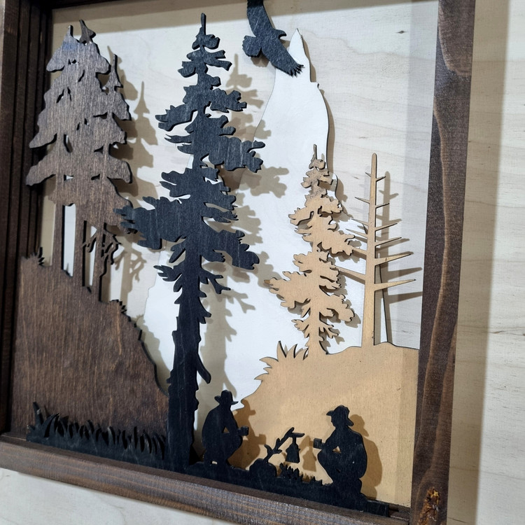 تابلو دکوراتیو چوبی طرح کمپ جنگلی ساخته سده از چوب پلای وود روسی که بصورت لایه ای برهم منطبق شده اند و تصویر عمق دار 3 بعدی ارایه میدهد