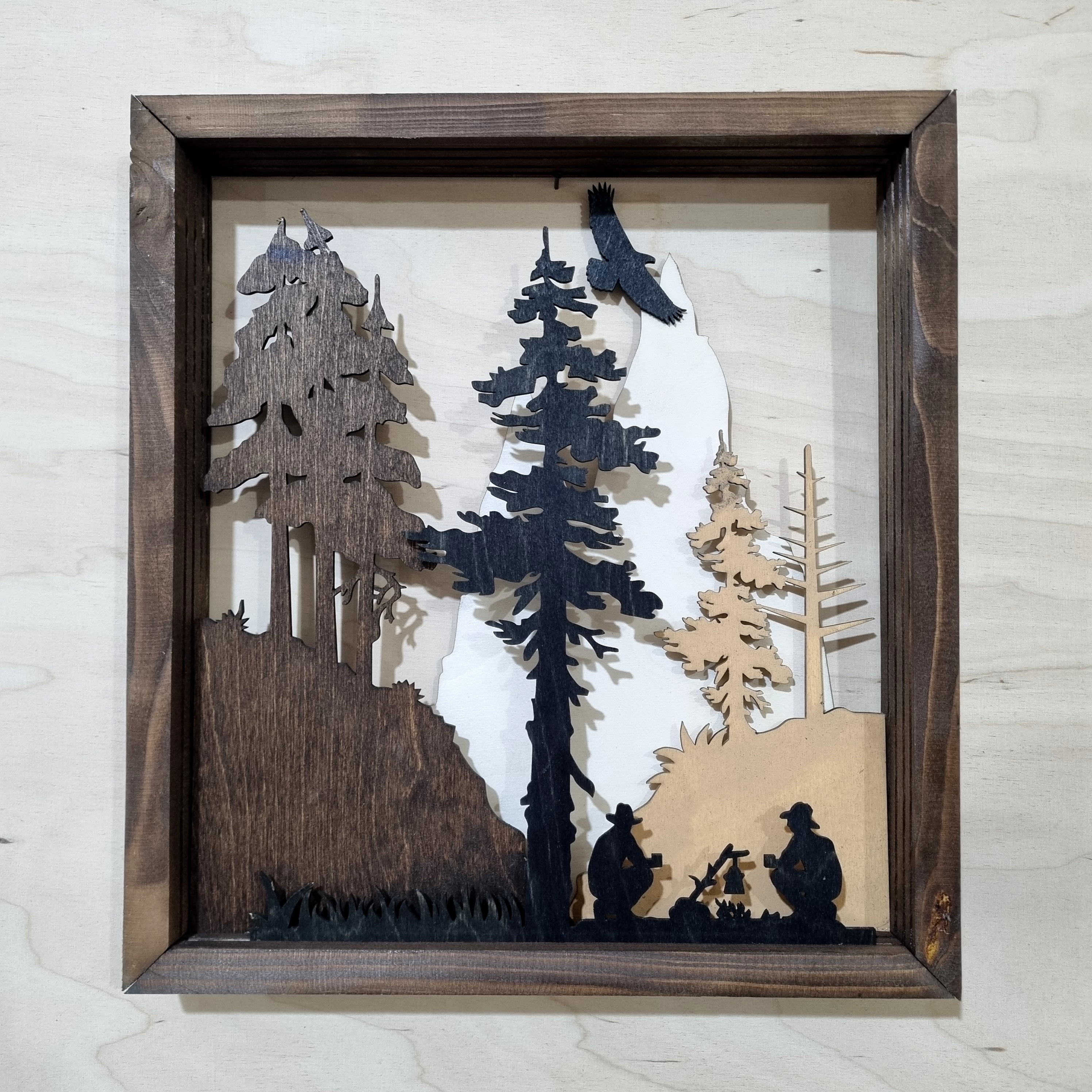 تابلو دکوراتیو چوبی طرح کمپ جنگلی ساخته سده از چوب پلای وود روسی که بصورت لایه ای برهم منطبق شده اند و تصویر عمق دار 3 بعدی ارایه میدهد