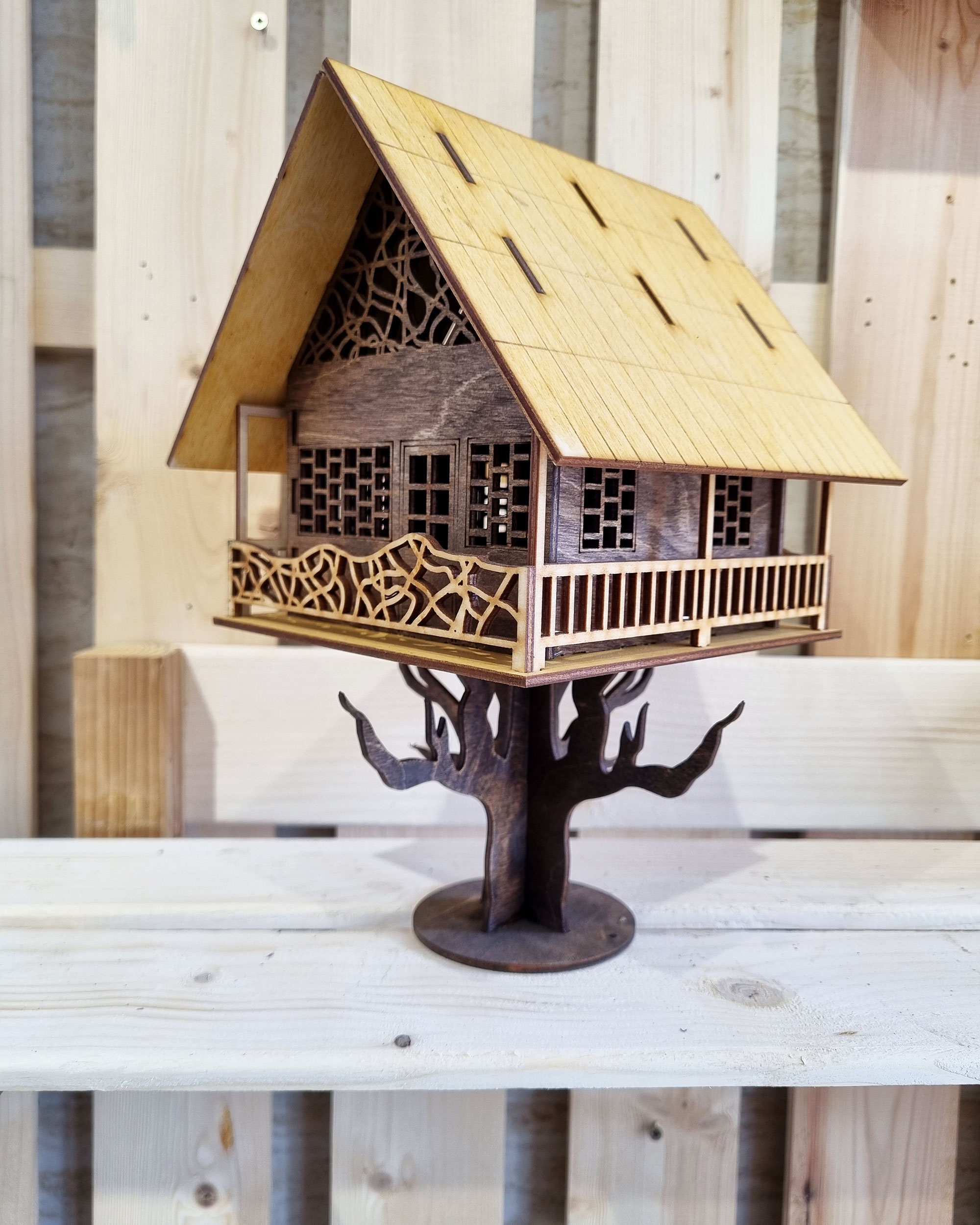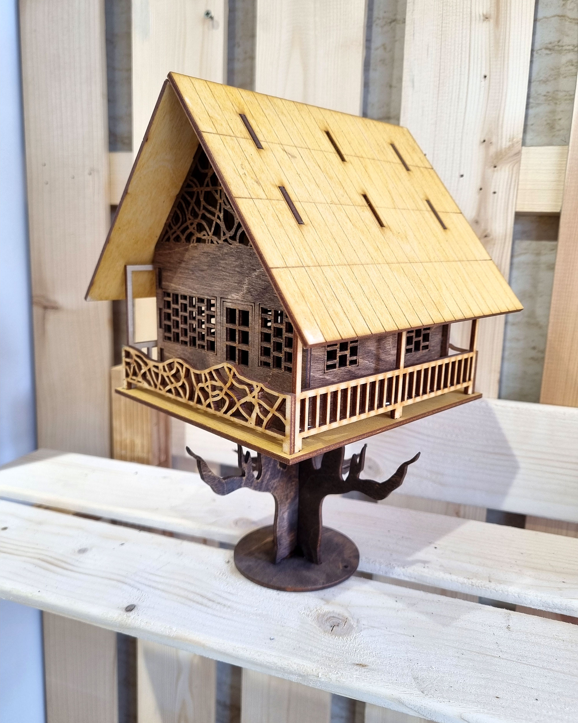 دکوری چوبی خانه درختی مینیاتوری ساخته شده از چوب طبیعی پلای وود درخت کاج روسی مناسب قرار گرفتن برروی کلیه سطوح مانند شلف و کتابخانه و میز و مز کنار مبلی و ویترین