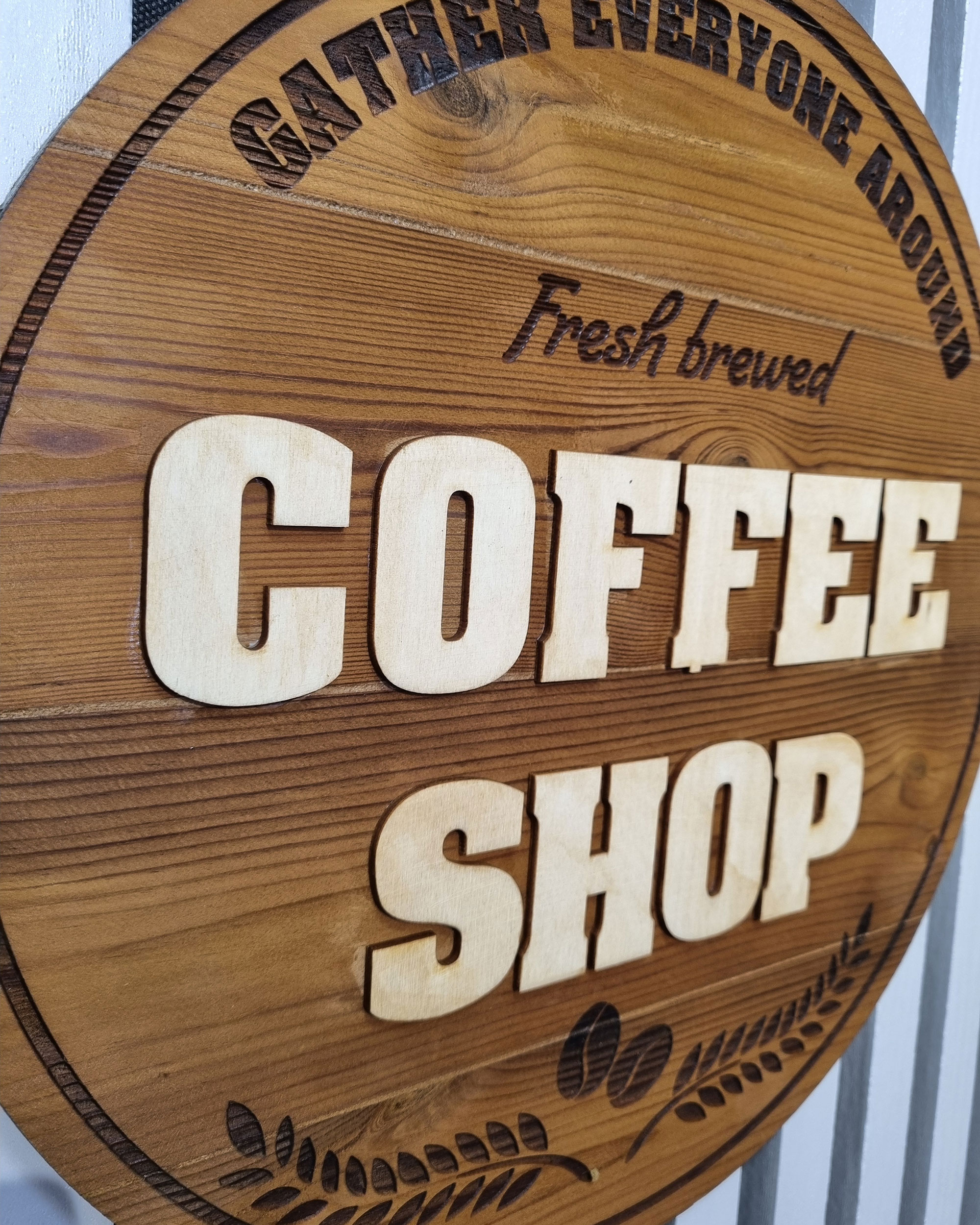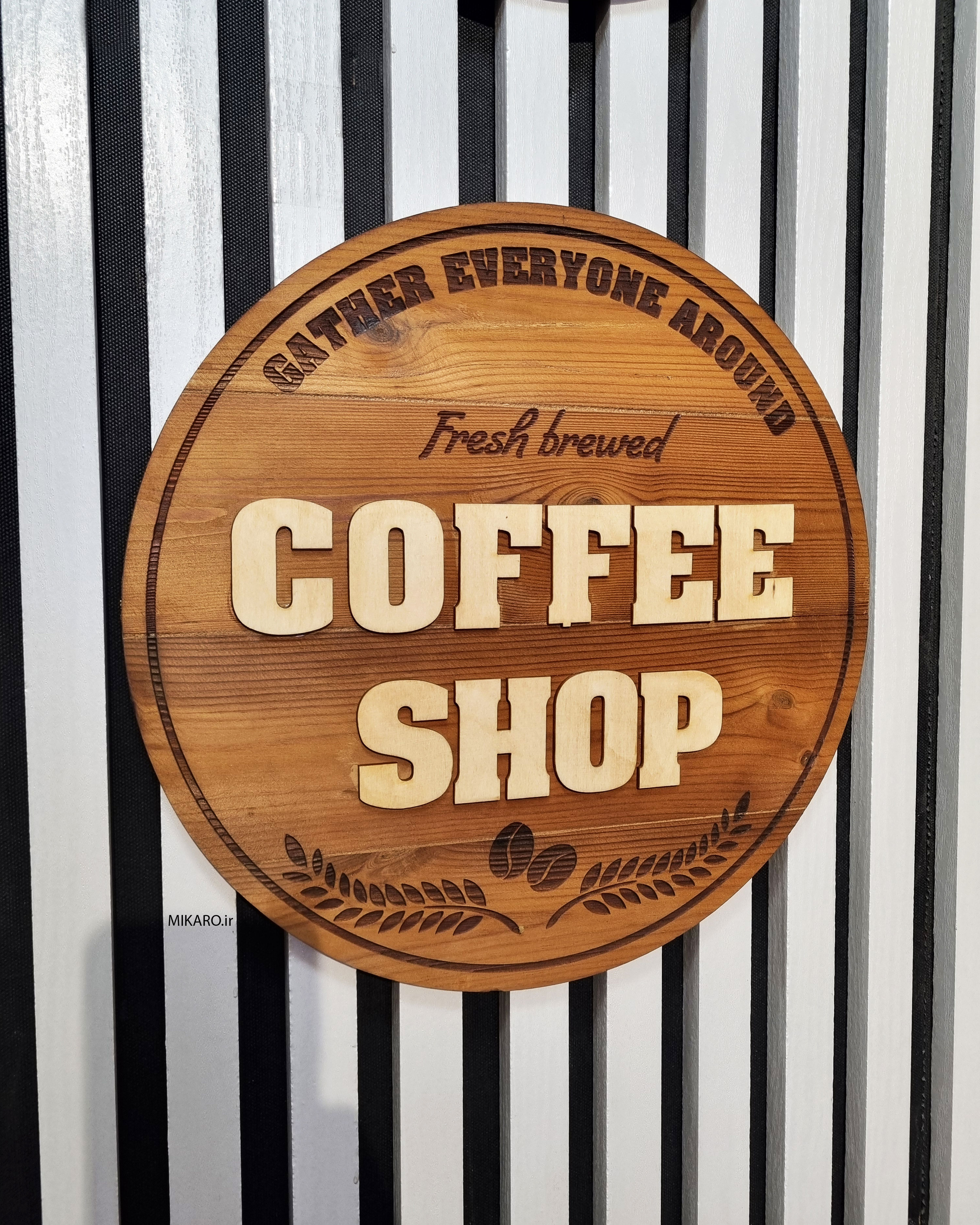 تابلو پلاک کافی شاپ دایره با قطر 3 سانتیمتر ساخته شده با چوبی ترمو وود